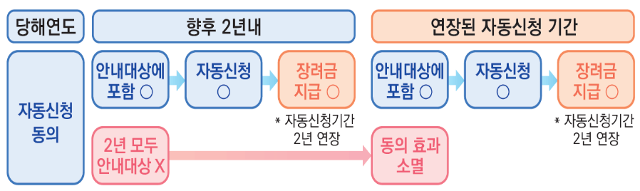 ✅ 올해 장려금 신청 시 자동신청 동의 후 앞으로 2년 동안 신청안내 대상에 포함될 경우 자동신청되고, 장려금을 지급받을 경우 자동신청 기간이 2년 연장됩니다.