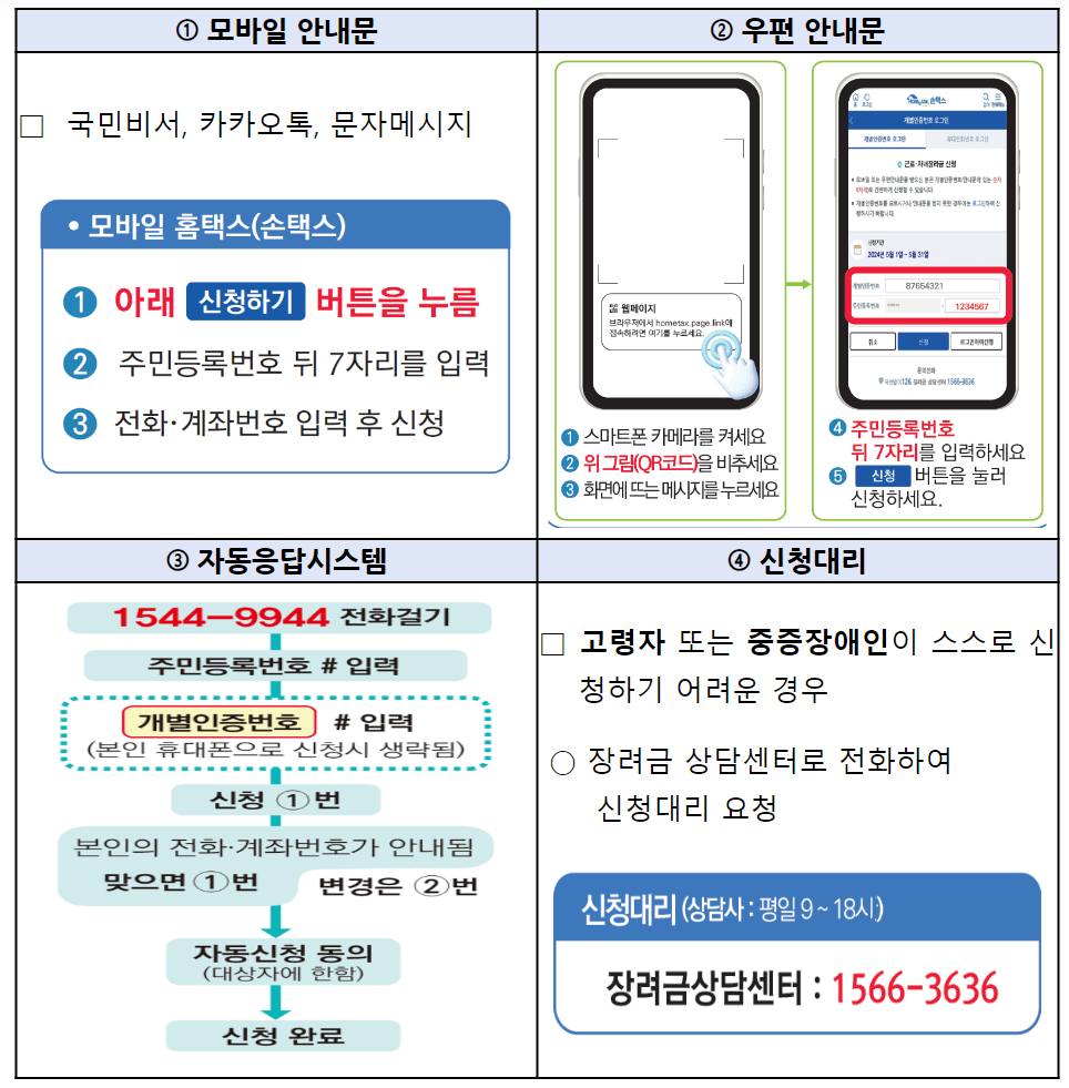 ✅ 60세 이상의 고령자 및 중증장애인인 신청대상자는 장려금 자동신청 제도를 활용하면 근로장려금 신청기간에 1회만 동의하면 다음연도부터는 별도의 신청절차 없이도 자동으로 신청이 됩니다.